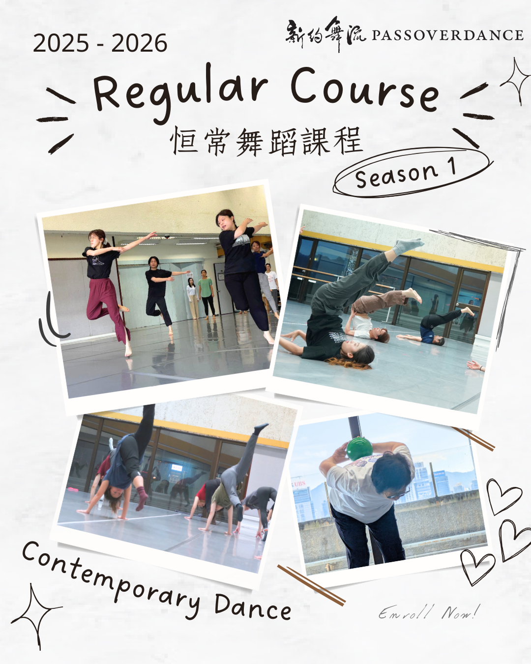 在專業教師的指導下,學員將學習當代舞的核心技巧,並透過系統性的訓練增強身體的靈活性、力量及控制力。