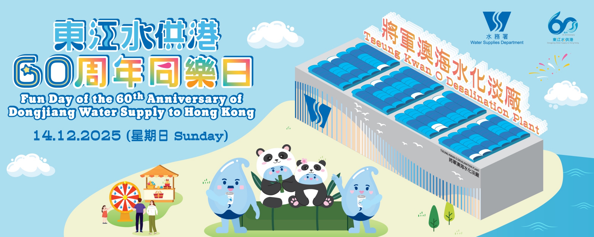 今年為東江水供港六十周年,為紀念及慶祝這個重要的里程碑,水務署將於2025年12月14日(星期日)於將軍澳海水化淡廠舉辦「東江水供港60周年同樂日」。現場設有專題展覽、攤位遊戲、表演、紀念活動回顧等,宣揚東江水為香港注入生命力、正能量和社會共融的文化氛圍,讓市民深入了解東江水供港的歷史和意義,以及節約用水的重要性。 巿民亦可參觀海水化淡設施,了解整個食水處理過程,包括逆滲透技術和相關科學知識。