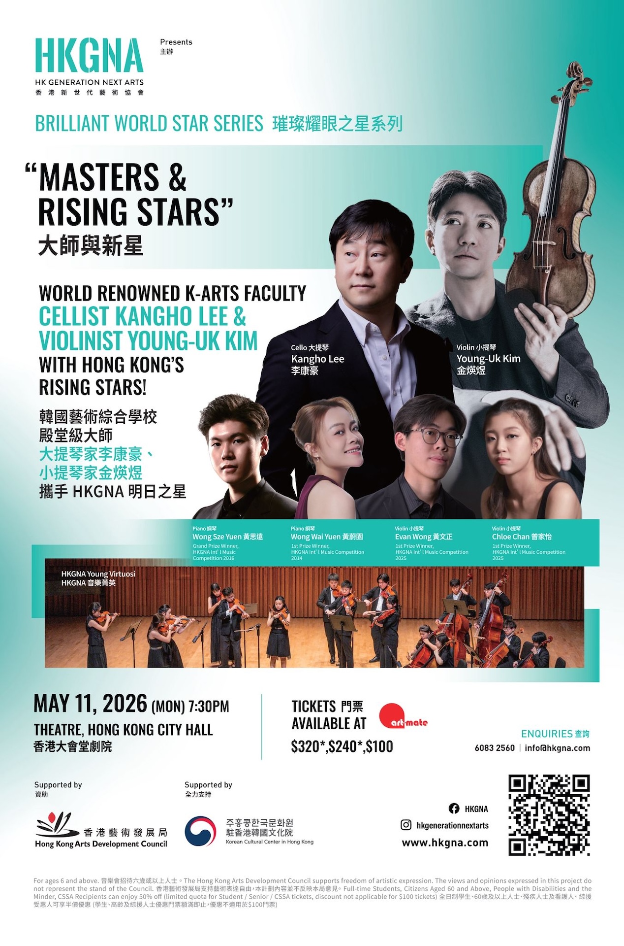 本場音樂會匯聚國際大師造詣與香港新一代樂壇菁英,誠邀您親臨見證:享譽國際的韓國藝術綜合大學 (K-ARTS) 教授、以卓越技巧與深厚藝術表現力著稱的大提琴家李康豪,將聯同世界知名 Novus 弦樂四重奏創始成員、小提琴家金煐煜 ,攜手呈獻一場迷人的音樂盛宴。